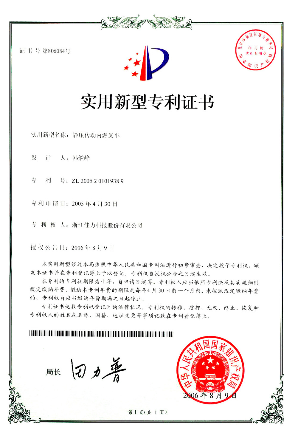 實用新型專利證書